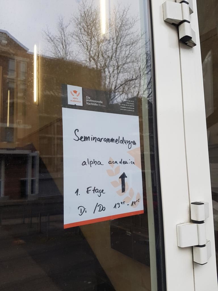 Der genaue Ort der Anmeldung ist an der Glastür (1.Etage, rechts) ausgeschildert. Dort müsst ihr dann nur noch ein Formular ausfüllen. Die Rechnung werdet ihr kurz darauf per Mail erhalten, sofern noch Plätze für das Seminar vorhanden sind. Hierbei richten wir uns nach 1) Eingang der E-Mail 2) Datum der schriftlichen Vor-Ort-Anmeldung.